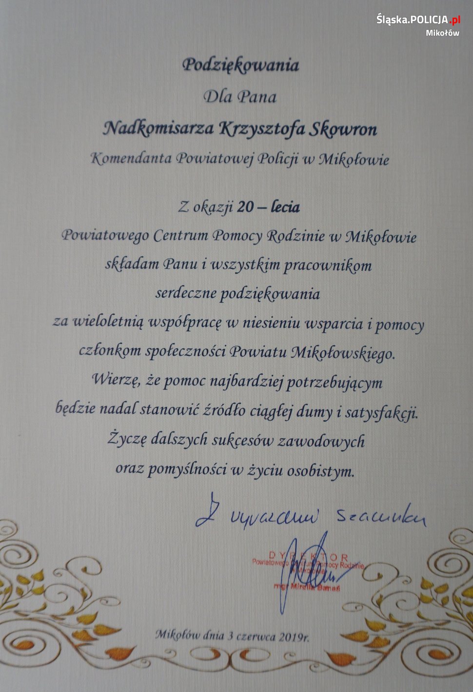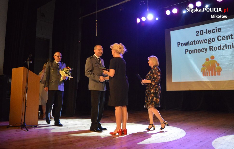 Wczoraj w Miejskim Domu Kultury w Łaziskach Górnych odbyły się uroczystości związane z Jubileuszem 20- lecia funkcjonowania Powiatowego Centrum Pomocy Rodzinie. W uroczystości udział wzięli przedstawiciele samorządów, sądu, ośrodków pomocy społecznej, szkół oraz organizacji społecznych. Obecni na uroczystości przedstawiciele mikołowskich policjantów: Komendant Powiatowy Policji w Mikołowie nadkom. Krzysztof Skowron oraz komendant łaziskiego komisariatu nadkom. Sebastian Krzysztofik, na ręce dyrektor placówki Mirelli Banaś złożyli podziękowania za wytrwałość i ogromne serce oraz życzyli dalszej satysfakcji z wypełniania misji wspierania potrzebujących. Dyrektor PCPR podziękowała również wszystkim instytucjom wspierającym ich działalność za wieloletnią pracę niesienia pomocy potrzebującym.