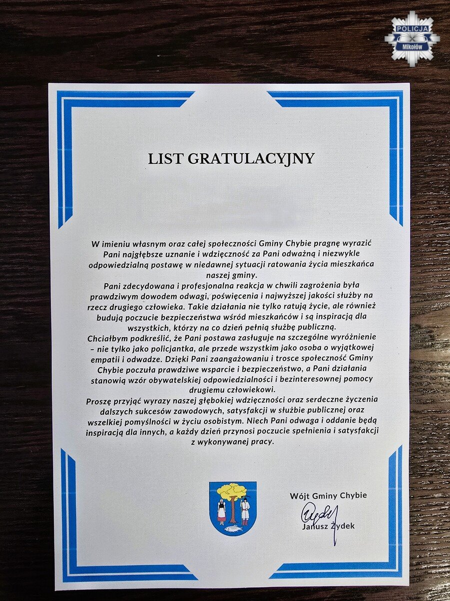 Na ręce Komendanta Powiatowego Policji w Mikołowie wpłynęło podziękowanie od Wójta Gminy Chybie dla mikołowskiej policjantki. Funkcjonariuszka w czasie wolnym od służby udzieliła pomocy mężczyźnie, który podczas uroczystości stracił przytomność i przestał oddychać. Pomoc policjantki oraz innych osób okazała się profesjonalna i skuteczna.