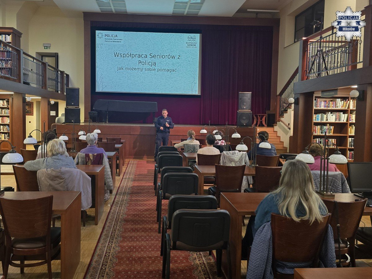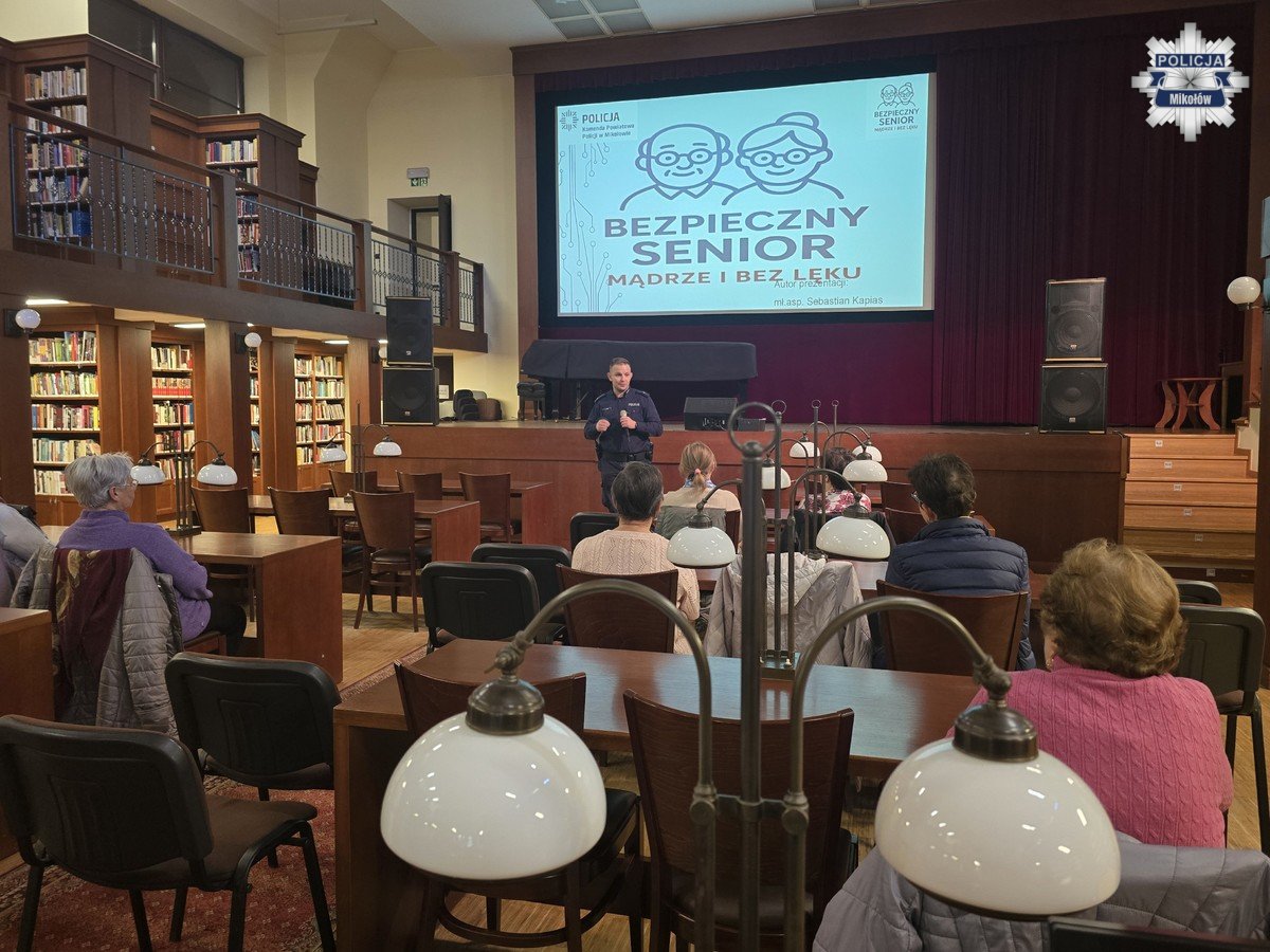 W ramach kampanii profilaktycznej mikołowskiej komendy „Bezpieczny senior - mądrze i bez lęku”, policjant z Komendy Powiatowej Policji w Mikołowie spotkał się dziś z seniorami, aby porozmawiać o bezpieczeństwie. Wydarzenie odbyło się w Bibliotece Miejskiej w Mikołowie, a jego celem było zapoznanie uczestników z nową kampanią społeczną skierowaną do seniorów.