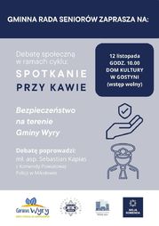 Komenda Powiatowa Policji w Mikołowie zaprasza na debatę społeczną, która odbędzie się 12 listopada br. o godzinie 10.00 w Domu Kultury w Gostyni. Tematem spotkania będzie bezpieczeństwo mieszkańców Gminy Wyry. Serdecznie zapraszamy!